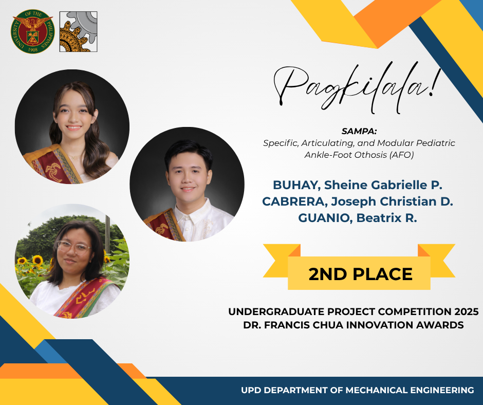 Three teams from the Department of Mechanical Engineering at UP Diliman earned Second Place in the Design Category of the 2025 Undergraduate Project Competition, held under the Dr. Francis Chua Innovation Awards. The event recognizes innovative undergraduate research and design projects across the College of Engineering.